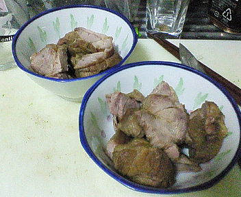 しかもまだまだ片付いていないところもあり。。。orz 俺の有給が。。。orz 今日は夜に、オオタニT会議が我が家であったので、 とりあえず久しぶりの客人のためにお夕飯を用意してみました。 まずは煮ブター。 肩ロースブロック買ってきてつくりました。 二郎っぽく柔らかくいかない。。。部位が違う? 煮過ぎ??? でもよく火を通さないと怖いからなぁ。。。 醤油だれは、みりんを多めにしたら割と上手くいったのですが。 そのまま食べるより、細切れにして炒飯にした方が良かったかな。 お次は麻婆豆腐ー。 麻婆豆腐の素なんて使わねぇぜ!!! 豚挽肉(あらびき)、豆板醤、ネギ等をしっかり炒め、 煮ブタ作った後の煮汁がもったいないのでスープとして使いまわし、 豆腐を煮込んで、甜面醤等で味付けして、 水溶き片栗粉でフィニッシュ!!! でもちょっと片栗粉入れすぎた。。。 まぁ割と上手くいったかな。 最後にほうれん草と三つ葉のおひたしのちくわミクスチャー。 スーパーのおさかな売り場で、 がっしりした美味そうなちくわが1本50円でトング売りしてたもんで、 パック詰めチクワしか知らない私は思わず買っちゃいました。 これが程よい塩気でウマー。。。 もっと買っておきゃよかった。。。 で、緑の野菜を食卓に加えたかったので、 特売してたほうれん草と三つ葉を使っておひたしに。 で、ちくわも和えて、うっすらポン酢で味付け。 んでもって、みんなで食卓囲んで会議。 家族団欒のひととき。w うーん。朝から晩まで家事だぜ。 掃除、洗濯、炊事。 スーパーの特売でバランスを考えて夕飯の献立を立てるなんて、 主婦っぽいな俺。。。 たまには楽しいけど、毎日は、やってられんわな。。。 余談ですが、初めてカミソリというものを使いました。 キレテナーイの安全髭剃りじゃなくて、ほんとに切れるやつ。w 凄い切れ味で、顔面血まみれになりました。w