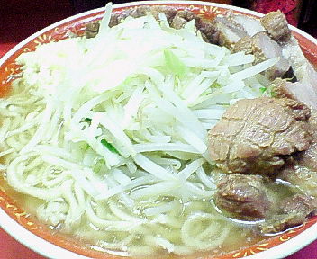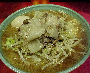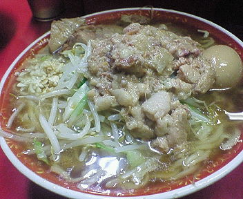 --- 新宿でライブを観た後、さぁ帰って勉強しようと、 新宿駅へ向かったはずなのに、 着いた先は、ラーメン二郎歌舞伎町店。w 俺ってヤツは途中で引き返しやがって。www とある二郎掲示板に、 「今日の深夜、歌舞伎町店で俺の隣に座ったヤツに煮玉子おごる」 とかって書き込みがあって、w 本当に書き込み者探そうかと思ったが、w 深夜ってほどの時間でもないので、自分で煮玉子買うことにした。w 大ダブル野菜ニンニクあぶらカラメ煮玉子。 大ダブルだったわけだが、 普通のブタの他に、細切れなブタが入っていた。 最近はこんな感じ? ま、店員が多そうだから、人によって違うのかもな。 しかし、良い意味で予想を裏切ってくれたのが煮玉子。 歌舞伎町の煮玉子、美味いじゃん! ちょっと薄味な味付けだったが、半熟具合も良くて、美味かった。 盲点だったなぁ。。。今まで頼んだことあったっけかなぁ。。。 ま、そんな二郎掲示板の書き込みのお陰で、煮玉子の良さにも気付き、 わざわざ折り返してきた甲斐があったってもんです。w