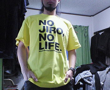 --- 朝9時にもわずかに届かない頃、俺は、 マンションの外に入ってきたトラックのエンジン音で目を覚ました。 おそらく宅急便だ。そしてウチに違いない。 俺はそわそわし始め、ベッドから抜け出し、 印鑑と代引き料金を握り締め、インターホンを待った。 待った。 待った。。。 彼はなかなか来ない。 そうこうしているうちに9時をちょっと回った。 落ち着け、俺、と自分に言い聞かせながら、 ベッドにちょこんと腰掛け、待った。 待った。 ピンポーン。 「たっきゅーびんでーす。」 彼は律儀に9時5分に来た。w 配送時間が9時以降だからって、別に9時前に来てもいいのに。。。 ってワケにもいかないか。 とか思いながら品物を受け取る。 はやる心を抑えるために、小さく一呼吸し、 それでも全然抑えきれない心で包装を引っぺがす。w 通販Tシャツ、キターーーーーー!!!!!! NO JIRO, NO LIFE!!! 実は諸事情でこのTシャツは現在非売品となってしまったようで残念な限りだが、 このTシャツを制作・販売する経緯が、以下の作者様のWeblogの記事になっており、 非常に熱く、思わず涙腺を刺激された俺様でした。w http://ramenclub.t-galaxy.com/e735.html