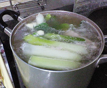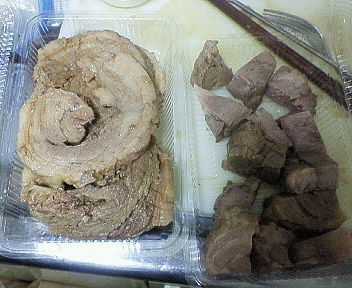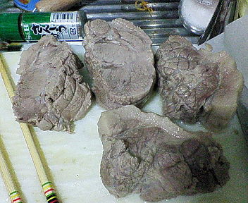 --- 夜に、なりたけ先生の家で開催される鍋パーティーに持っていくために、 久しぶりに煮ブタを仕込む。 昼に近所の肉のハナマサにブタのブロックを買いに行く。 気合いを入れるため、二郎Tシャツを着てブルゾン羽織って行った。w いつもは肩ロースのブロックで作るんだが、 豚バラでも作ってみたくなったので、両方買った! 豚の量が多いので、 ネギを増量して、2本をバキバキと折りながら鍋に投入する。 あと、青森産ニンニク2かけと、生姜を1個、適当にザクザク切って投入。 匂い消しに醤油も少々入れる。 肩ロースブロックは最初からネットがしてあるのでそのまま投入するが、 バラブロックは、そのまま板状のため、切ってからたこ糸で縛る必要がありそう。 とか思ったが、板状を丸めりゃ巻きバラになるじゃん!とか思い立ち、 体重をかけてぐるぐる巻いてからタコ糸で縛って鍋にぶち込みました。 グツグツ煮込み中。 肩ロースは50分程度で充分火が通ったので、出す。 巻き豚はまだまだ中に火が通っていないので継続して煮込み中。 まずは、煮上がった肩ロース。こんな感じ。 醤油と味醂を混ぜたものに、生姜をおろしたものと、鍋の中のスープを少々入れ、 そして二郎風なら忘れちゃいけない化学調味料(味の素)を入れ、w 味見をしながら豚を漬けるタレを作っていく。 タレをジップロックとかの、ジッパーつきの保存袋に入れ、 煮上がった豚を入れて、味を染み込ます。 う~ん。。。 肩ロースは50分程度煮込んだが、もうちょっと煮込み時間短くてもいいかな。 もうちょっと柔らかく作りたいな。 でも、もうちょっと豚の臭みを取りたいなぁ。 茹で時に消すのか、タレ時に消すのか。 割と難しい。 そうこうしているうちに巻きバラの方も煮上がったので出す。 1時間半くらい煮込んだかなぁ。。。 以下のは巻きバラ煮上がり後。こんな感じ。 で、こちらも同様にタレに漬け込み、出来上がったわけだが。。。 、、、美味い!!! バラの煮ブタは初めて作ったが、 あまり豚臭くないし、(よく煮込んだから?それとももともとそういう肉?) 脂身が多くて甘味があって、これは美味い。。。 次から煮ブタは豚バラをメインにしよう。。。 ってことで、ブラスチック容器に入れて出荷。 実際には写真の二倍の量作った。 あー。 煮豚に囲まれていると、まじで幸せだね。。。
