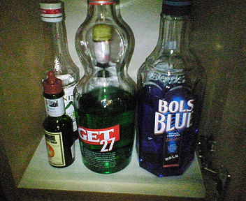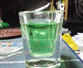 --- 別段書くこともないので、 大好きな酒のことでも。。。 チェコ ストロング アブサン。 アブサンである。 なんと美しい緑。。。 アブサンといえば、 「幻覚作用」や「発禁」なんかのキーワードを連想する方もいよう。 アブサンは、原料にニガヨモギやアニスを始めとした、 薬草系のリキュール。 このニガヨモギの成分のうち、「ツヨン」という成分が、 幻覚作用を引き起こす疑いがあるとされ、 昔、発禁処分になった酒だ。 その後、ツヨンの量が抑えられたものが解禁となり、 再び流通するようになったんですな。 ゴッホが自画像描くのに耳を切り落としたなんつーのも、 アブサンの幻覚作用だった、なんて逸話もある。 ホントかどうか知りませんが。。。 でも、そんな話が素敵じゃない!!! 俺は、酒にまつわる、そんな話が大好きですよ~。 とかく酒にはさまざまなドラマが付き物であるが、 その中でもこのアブサンという酒は、 特にその魅力で俺の心を惹き付けて離さない。。。 写真のアブサンは、60度!!! これをストレートでやってりゃ、 幻覚作用があろうがなかろうが、頭がとびます。w これを知人の家でストレートでチビチビやりながら、 ボンバーマンをやってたら、 開始時に足元に置いて自爆!!!とか普通にやるようになってた。w そりゃゴッホも耳切り落とすわな。(ぉぃ 更にこのアブサンという酒、 水を加えると白濁するという性質をもった面白い酒なんである。 水を加えた写真。 う~ん。。。白濁しねぇな。。。(^^; でもね、以前飲んでた「ABSENTE(アブサント)」ってアブサンは、 もっと白濁したんだぜ。確か。 でも、ABSENTEはちょっと甘すぎてあまり好みでは無かったな。。。 やっぱチェコストロングアブサンをストレートでやるのが大好き!!! これ、美味すぎます。 でも高かったので大事にちびちび飲んでます。 6000円くらいだったかしら。。。 ついでなので家にある酒の写真を撮ってみた。 タンカレーやらフィンランディアやらメーカーズマークやら、 ストリチナヤ、エルジマドール、アマレット、カンパリとかとか。 ちっこい瓶はスピリタス。 シュリヒテ・シュタインヘイガーにティアマリア、 カルーア、モーツァルト、チンザノ、クエルボ、オーレ、 ボウモア、ジャックダニエル。。。 手前中央のは241ちゃんに頼んで空き瓶を譲ってもらった、 山崎のシリアルナンバーの入った、なんか凄いやつ。w 香りが消えるのがもったいなくて洗ってない。w ノイリープラットにバカルディ、ボンベイサファイヤ、ブードルスとか。 GET27に、ボルスのブルーキュラソー、 オレンジビターズとか、アンゴスチュラビターズとか。 あー。みんなを家に招待して振舞いたい。 でも部屋が汚いから誰も招く気がしない。w なので、ほとんど一人で飲んでる。 まだまだ写真に写っていない酒もあるよ。 最近飲む量減ったけど、新しい酒を開拓したくなってきちったな。。。 |