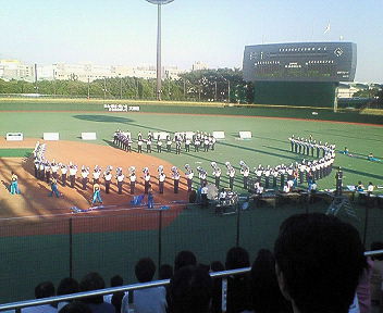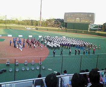 --- マーチングのようでマーチングでない。 ドラムコー。 その実態は、ハイレベルにショーアップされた高機動吹奏楽団だっ!!! 会社の同期にたまたまこのドラムコーに参加している人がいたお陰で、 幸福にもこの世界に出会えて、毎年大会をチェックして観に行くに至る。 毎年一緒に観に行っているオオタニT(個人)と、 今回初めて観るナリタケ先生と一緒に観に行った。 青く広がる空の下、秋の陽射しを少しも遮らない開放された球場で、 缶ビールをやりながらドラムコー観戦!!!!!! なんという絵に描いたような休日。シアワセすぎるぜばかやろう。 ドラムコーの素晴らしさは今年年明けの大会を観に行った日記で、 さんざん語ったので、そちら参照の事。 DrumCorpsJapan CHAMPIONSHIP 2007 開演前。 早く観たくて体が疼く。。。ああっ!ジラさないでっ!!! 5番目、THE YOKOHAMA SCOUTS の演奏前の音出し風景。 演奏中を撮りたかったけど、シャッター音鳴らすの嫌だし、 演奏中の一場面を撮り収めたところで、俺の腕じゃ少しも伝わらんだろうからな~。。。 この素晴らしさは観ないとわかりません! 屋外、且つ、平和島だからこその光景。飛行機。 ほんとに真上を低く通ることもあった。 なんかファミスタを思い出した。 閉会式。 本日の成績発表と、最後の全員合奏。 どのコーもアツく、俺には順位なんてつけられん!!! それでも順位が決まっていく切ない場面。。。 しかし最後は、お互いを称え合い、 ドラムコーという同じ世界に生きていることを喜ぶかのような、 恒例の全体合奏。 曲も毎回恒例、The Everly Brothers(エヴァリーブラザーズ)の、 「Let it be me」。 ばか!泣けるんだよこれ!!! 遊びじゃねーんだ!!!青春なんだっっっ!!!!!! らーらーら、らーららーら、らーらーら、らーらーらーらー。。。 暖々でおなかいっぱい。 ドラムコーで胸いっぱい。 最後の余韻を、平和島の倉庫群に映った夕陽が演出する。。。 夕方の鐘の音が、Let it be me だったら、 俺は毎日、夕方に涙を堪えるに違いない。w ハイレベルな音楽ほどマイナーであることが寂しい。 次回11月11日日曜日、 味の素スタジアムでの All Japan Championships で、 俺を感涙でビチョビチョに濡らしておくれ!!!ドラムコー!!!!!! PR